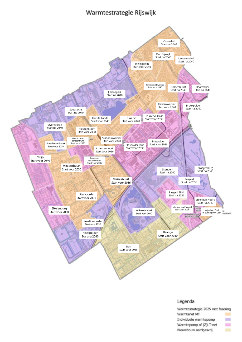 De planning is dat de eerste huurwoningen in Stervoorde en Hoekpolder worden aangesloten tussen 2028 en 2034. Daarna volgen de andere wijken in west Rijswijk. Het aansluiten van de rest van Rijswijk gebeurt daarna ook in fases.